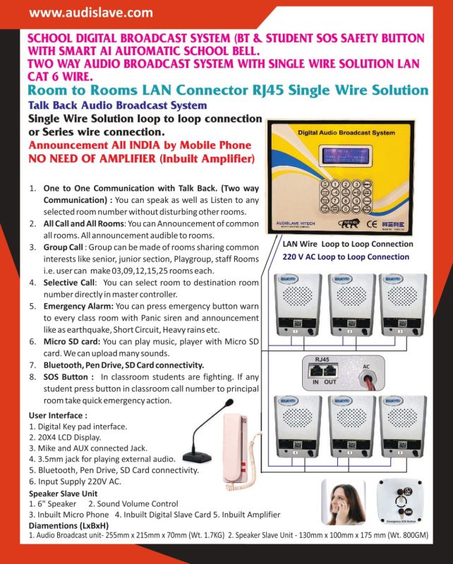 A digital 2-way audio broadcast system is a communication network that allows for both one-way broadcasting and two-way, interactive communication. Unlike a traditional public address (PA) system that only allows for one-way announcements, a two-way system enables the person making the announcement to receive a response from a specific location, or for that location to initiate a call to the central unit. This is often used in schools, hospitals, factories, and other large facilities to enhance safety, management, and efficiency.